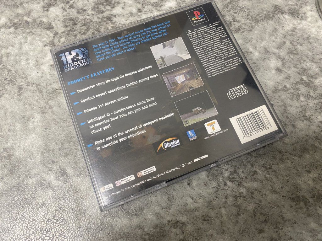 PS1 Hidden & Dangerous is a tactical action and stealth game developed by Illusion Softworks and released for PlayStation 1 (PS1) in 2001. This game is set in the World War II era and the player controls a team of four British Special Air Service (SAS) soldiers as they carry out various missions behind enemy lines.