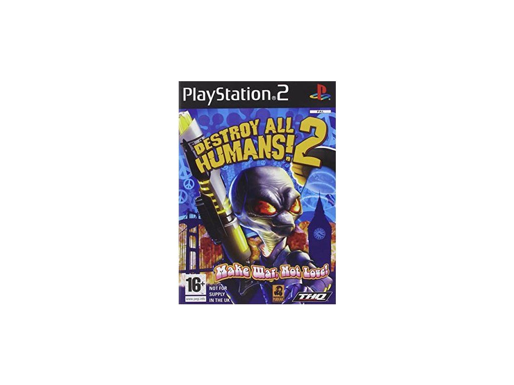 Destroy All Humans! 2 is an action-adventure game developed by Pandemic Studios and released by THQ for PlayStation 2 in 2006. Players take on the role of an alien named Crypto, who is tasked with infiltrating and taking over the Earth. The game is set in the 1960s and parodies social and political events of the time, including the Cold War and the hippie movement. Players can use various futuristic weapons and abilities such as telekinesis, dressing up as humans or flying in a flying saucer to achieve their goals and destroy human opponents.