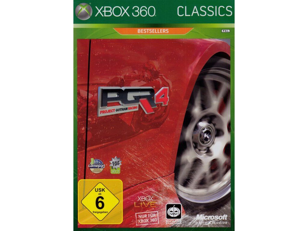 Xbox 360 Project Gotham Racing 4 is a racing video game developed by Bizarre Creations and published by Microsoft Game Studios for the Xbox 360 console. The game was released in October 2007 and is the fourth installment in the Project Gotham Racing series.