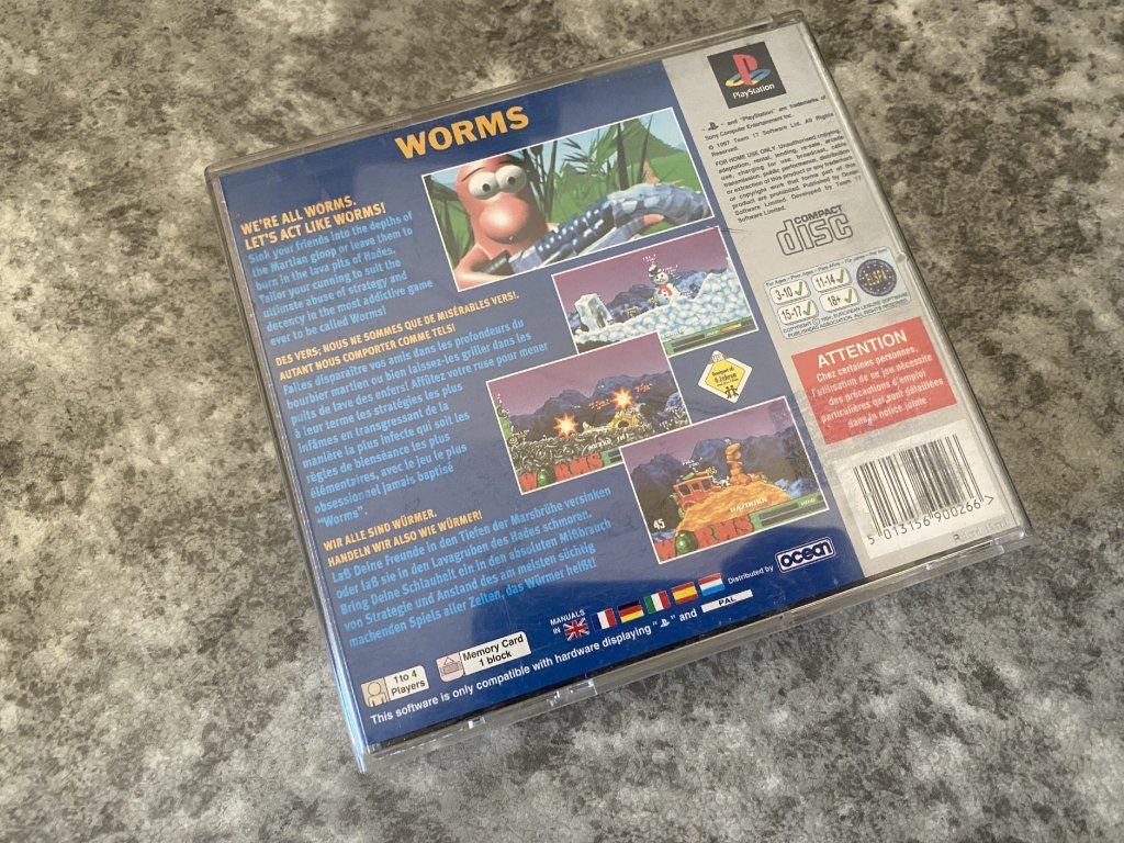 Worms pro PlayStation 1 je kultovní tahová strategická hra, ve které proti sobě bojují týmy kreslených červíků s širokou paletou zbraní – od klasických bazuk a granátů až po ikonické ovečky, banánové bomby či svatý granát. Každý tým červů se snaží zlikvidovat protivníka na zcela zničitelném bojišti, kde hraje roli jak přesná muška, tak taktika a prostředí. Hra se odehrává ve tazích, což dává hráčům čas na promyšlení každého útoku, ale také prostor pro humorné a chaotické situace.