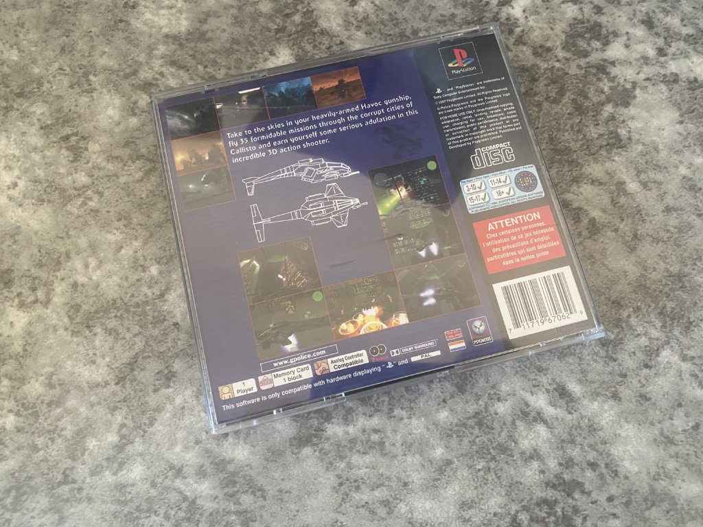 PS1 G-Police je futuristická letecká bojová hra vydaná pre PlayStation 1 (PS1) v roku 1997. Hru vyvinulo štúdio Psygnosis, ktoré je známe aj svojou prácou na populárnej sérii Wipeout.